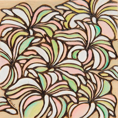 咲き乱れるレインボープルメリアが太陽の光を浴びてさまざまな色彩に描かれている、ハワイの光の魔法が感じられる作品です。