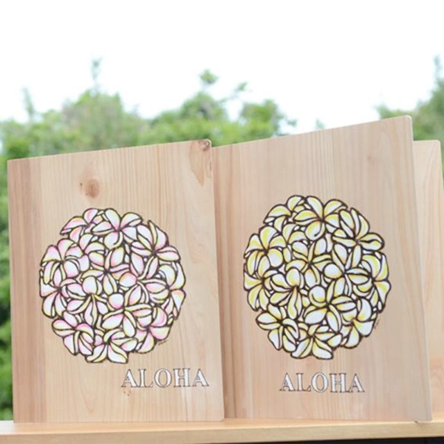 プルメリアサークル/イエロー:丸く描くたくさんのプルメリアは穏やかに包み込むように描きました。温かみのあるデザインです。